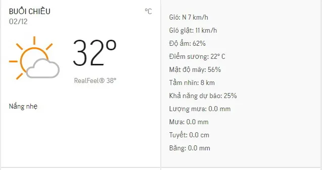 Chiều 2/12 trời có mây thay đổi từng đợt, không mưa (Nguồn: Accuweather)