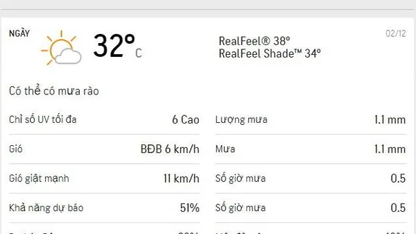 Sáng Thứ Tư (2/12), TPHCM có nắng, lượng tia UV ở mức 6 lúc 11 giờ (Nguồn: Accuweather)
