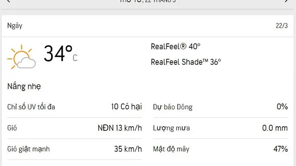 • Chiều 22/3, trời có mây lúc đầu giờ. Từ sau 15 giờ, mật độ mây giảm nhanh, nắng đến cuối giờ.