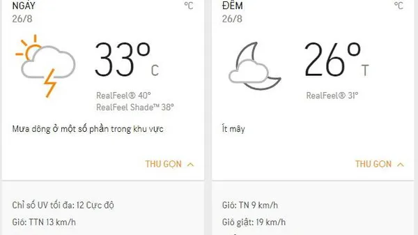 - Chiều ngày 26/08, trời có mây thay đổi, khả năng 51% có mưa dông lúc 13 giờ. Cuối giờ chiều có nắng.