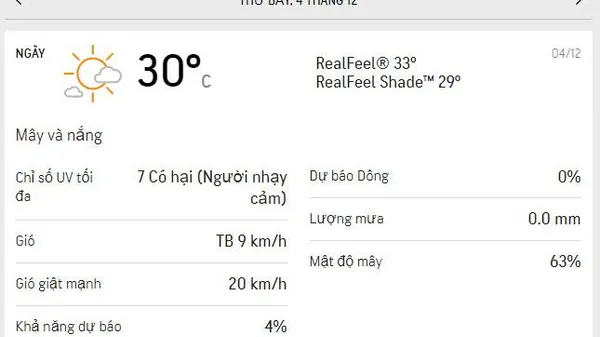 Buổi chiều 4/12 trời có nắng và mây xen kẻ; độ ẩm không khí thấp (Nguồn: Accuweather)