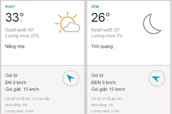- Độ ẩm 63-82%. Gió 9-11km/h, hướng Đông Nam.