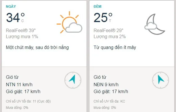 - Độ ẩm 47-58%. Nhiệt độ buổi chiều tăng nhẹ, trong khoảng 30-34 độ C