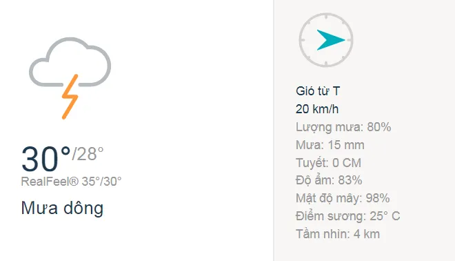 • Buổi chiều trời nhiều mây, có thể có dông gió nhiều vào các thời điểm từ 3-5 giờ chiều - tầm nhìn xa giảm còn 3 km.