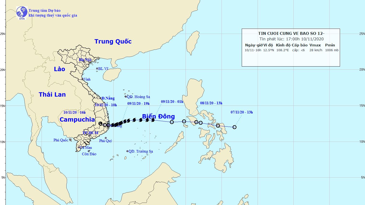 Hồi 16 giờ ngày 10/11, vị trí trung tâm vùng áp thấp ở khoảng 12,5 độ Vĩ Bắc; 108,2 độ Kinh Đông, ngay trên khu vực Tây Nguyên. Sức gió mạnh nhất ở trung tâm vùng áp thấp giảm xuống dưới cấp 6 (dưới 40km/giờ).