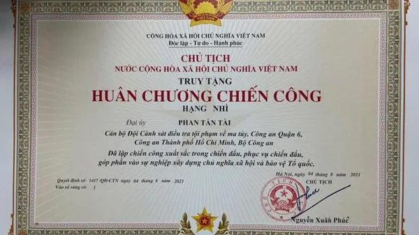 Theo Quyết định, truy tặng Huân chương Chiến công hạng Nhì cho Đại úy Phan Tấn Tài, Cán bộ Đội Cảnh sát điều tra tội phạm về ma túy, Công an Quận 6, Công an TPHCM, Bộ Công an, đã lập chiến công xuất sắc trong chiến đấu, phục vụ chiến đấu, góp phần vào sự nghiệp xây dựng chủ nghĩa xã hội và bảo vệ Tổ quốc.