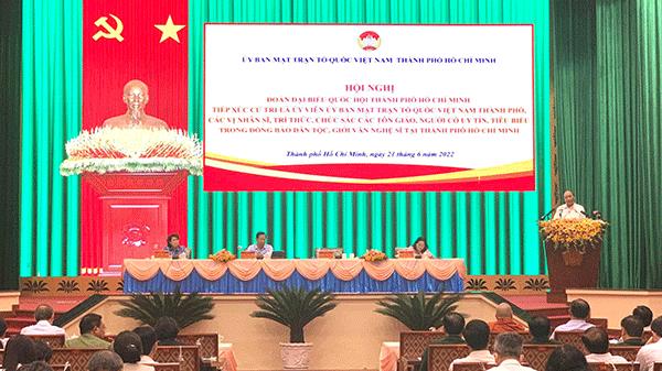 Tại hội trường Bộ Tư lệnh TPHCM, Chủ tịch nước Nguyễn Xuân Phúc cùng Đoàn Đại biểu Quốc hội TPHCM tiếp xúc cử tri là Ủy viên Ủy ban Mặt trận Tổ quốc Việt Nam Thành phố, các vị nhân sĩ, trí thức, chức sắc các tôn giáo, người có uy tín, tiêu biểu trong đồng bào dân tộc và đại diện giới văn nghệ sĩ tại TPHCM để lắng nghe ý kiến, kiến nghị của cử tri Thành phố, qua đó ghi nhận những khó khăn, vướng mắc, bất cập liên quan đến các quy định, pháp luật hiện hành, đồng thời thông tin kết quả kỳ họp thứ 3 Quốc hội khoá XV.