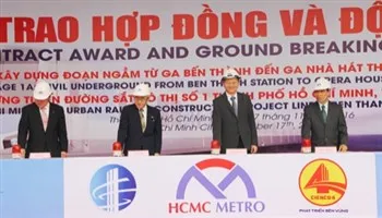 (VOH) - Ngày 17/11, Ban Quản lý đường sắt đô thị Tp. Hồ Chí Minh tổ chức lễ trao hợp đồng và động thổ gói thầu 1a xây dựng đoạn ngầm từ nhà ga Bến Thành đến ga Nhà hát thành phố tuyến đường sắt đô thị số 1 Bến Thành – Suối Tiên (tuyến metro số 1) với liên danh nhà thầu Sumitomo Mitsui – Cienco 4 với giá trúng thầu 4.850 tỷ đồng (tương đương 25,6 tỷ Yên Nhật).