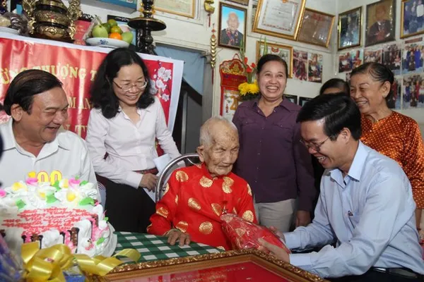 Ông Võ Văn Thưởng mừng thọ Mẹ Việt nam Anh hùng Nguyễn Thị Ghi (Ảnh: Tuyết Nhung)