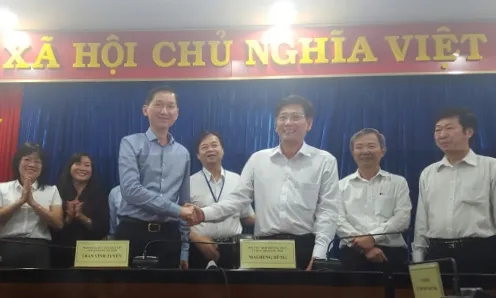 Phó Chủ tịch UBND TPHCM Trần Vĩnh Tuyến và Phó Chủ tịch UBND tỉnh Bình Dương Mai Hùng Dũng trong buổi ký kết.
