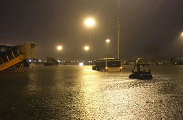 Bên trong sân bay ngập nước do mưa lớn - Ảnh: TTO