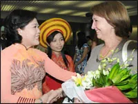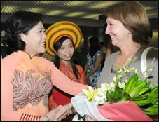 Phó chủ tịch UBND TP.HCM Nguyễn Thị Hồng (trái) tặng hoa chúc mừng bà Nina Fedorova, du khách quốc tế thứ 3 triệu đến từ Nga, tại sân bay quốc tế Tân Sơn Nhất sáng 21-12. |